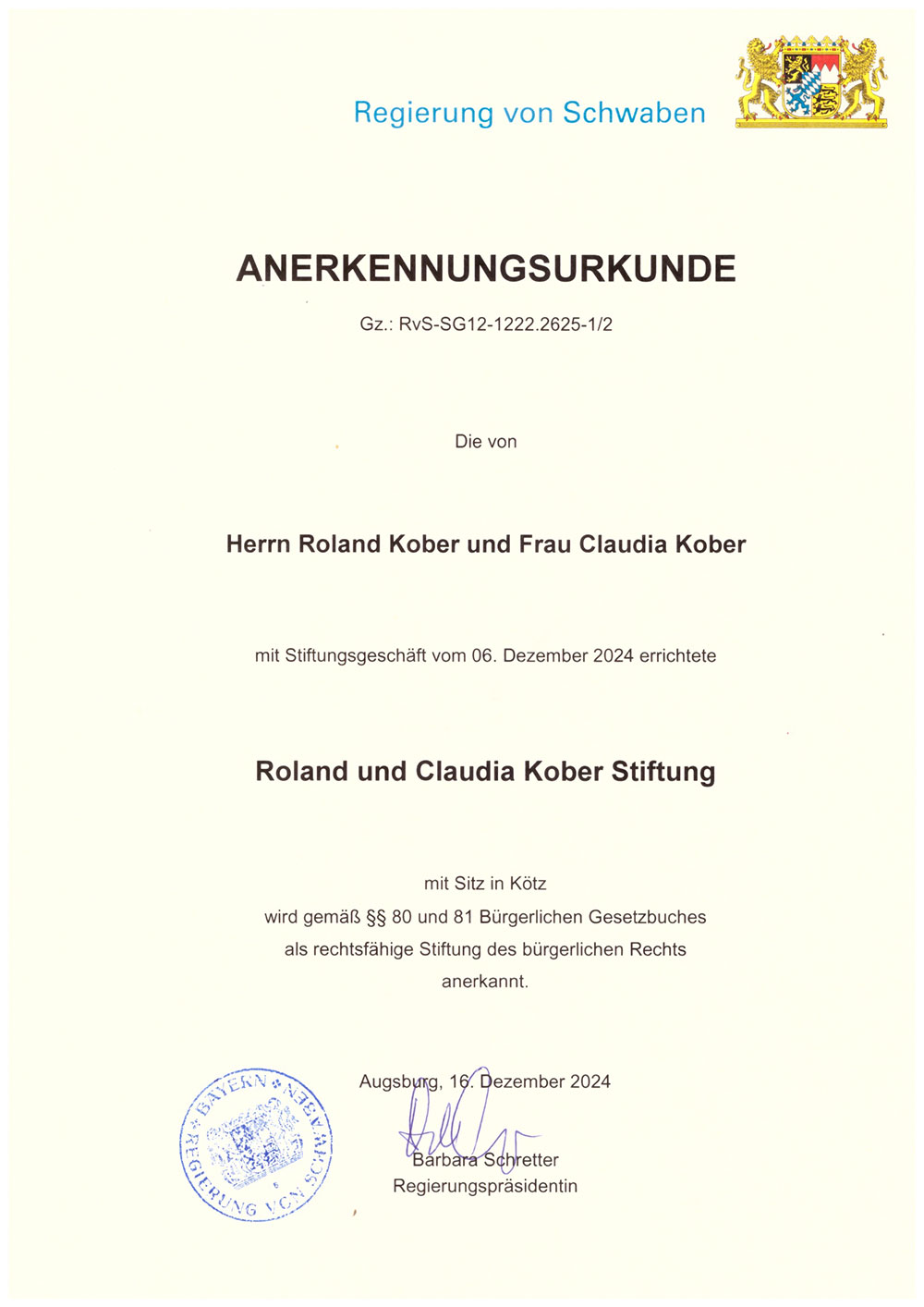 „Im Bewusstsein um die gesellschaftliche Verantwortung und im Willen, der Gesellschaft etwas zurückzugeben, haben wir im Jahr 2024 die Roland und Claudia Kober Stiftung ins Leben gerufen. Sie basiert auf christlichen Grundwerten, der Verantwortung eines jeden für sich selbst und für die Gemeinschaft. Die Festlegung des Stiftungszwecks war geprägt von dem Wunsch, dass all die Vorhaben, die uns bereits zu Lebzeiten wichtig waren, nach unserem Tod weiter gefördert und unterstützt werden.“